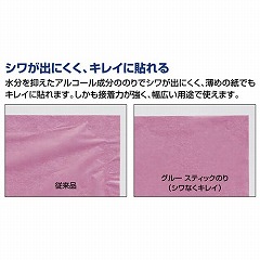 四角いから角にも細部にも塗りやすい。机の上でも転がりにくい。のりの乾燥がしにくく、360°開けやすいキャップ。エコマーク取得商品。シワなくきれいに貼れる。