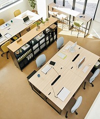 働き方が広がるデスクシリーズ。デスク、フリーアドレスデスク、ハイデスク、ミーティング用テーブル、シェルフのカラーリングを統一できます。
