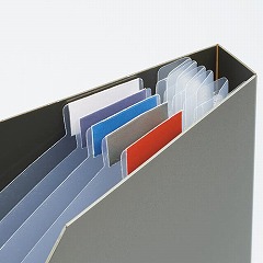 ジャバラに広がって自立するファイル。A4クリヤホルダーも収容できます。