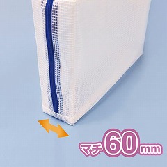 通常の2倍のマチ60mm幅のメッシュケースです。トラベル用にスーツケースの収納としてや、防災用品などの収納にも便利です。ファスナーはL字型で大きく開くので出し入れも簡単です。
