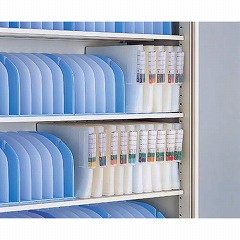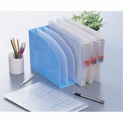 カルテフォルダーの整理に便利なスタンド。縦置きでも使用可能。背部・底部はフォルダーがすべりにくい工夫をしています。