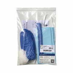 ●セット内容(1袋分)/キャップ1枚、シールド付マスク1枚、グローブMサイズ2枚、シューカバー2枚、ビニールエプロン1枚