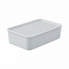 シンプルで丸みのあるやわらかなデザインのフタ付き積み重ねBOXです。フタにふちがあるので、積み重ねても安定感があります。フタはトレーとして使用でき、小物も置けます。丸洗いができるので衛生的です。
