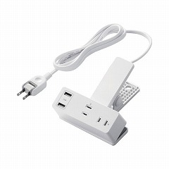 クリップ機構付きUSB-A電源タップ。常設できない場所に一時的に電源を設置可能。調理機器やテレワークに便利。コード約1.5m。