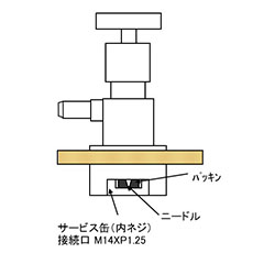 3.円盤も左に回して上げきりバルブをサービス缶にねじ込みます。
