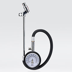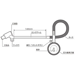 ●144mmのロングアームとダブル口金でタイヤバルブの位置を気にせずにタイヤの空気圧測定が可能。