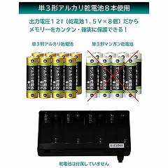 ●出力電圧12V(単3乾電池×8個)なのでメモリーを簡単・確実に保護できます。