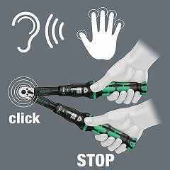 設定されたトルク値に達すると、クリック音とともに振動が手に届くため、クリック音が聞きづらい環境でも締め付け完了を判断できます