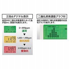 ●二酸化炭素濃度を、液晶ディスプレイの表示カラーと数値でお知らせします。