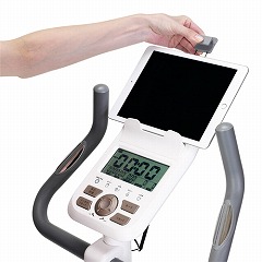 ●メーター部分にはタブレットの落下を防ぐ伸縮性のあるフックが付いたタブレットトレーを搭載し、タブレットやスマートフォンを置いて音楽や動画を楽しみながら運動が可能です。