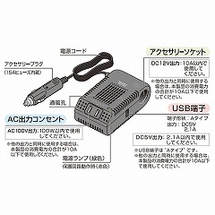 ●消費電力が100Wまでの家電製品を車内で使えるように、自動車の電源(DC12V)をAC100V/DC5V/DC12Vに変換する機器です。