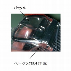 ①バックルのフック部分を道具等を用いて開いてベルトを抜きます。