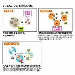 中和、付加、包括という植物抽出物の3つの化学反応により、臭いをごまかすマスキングと異なり、悪臭を「臭いのない物質」へと変化させます。
