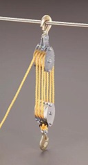 荷重の1/7の力で揚げられます。(1/7はあくまで理論値になります。実際は滑車とロープ等の摩擦やロープの重量の影響を受けるため、1/7以上の力が必要になります。)